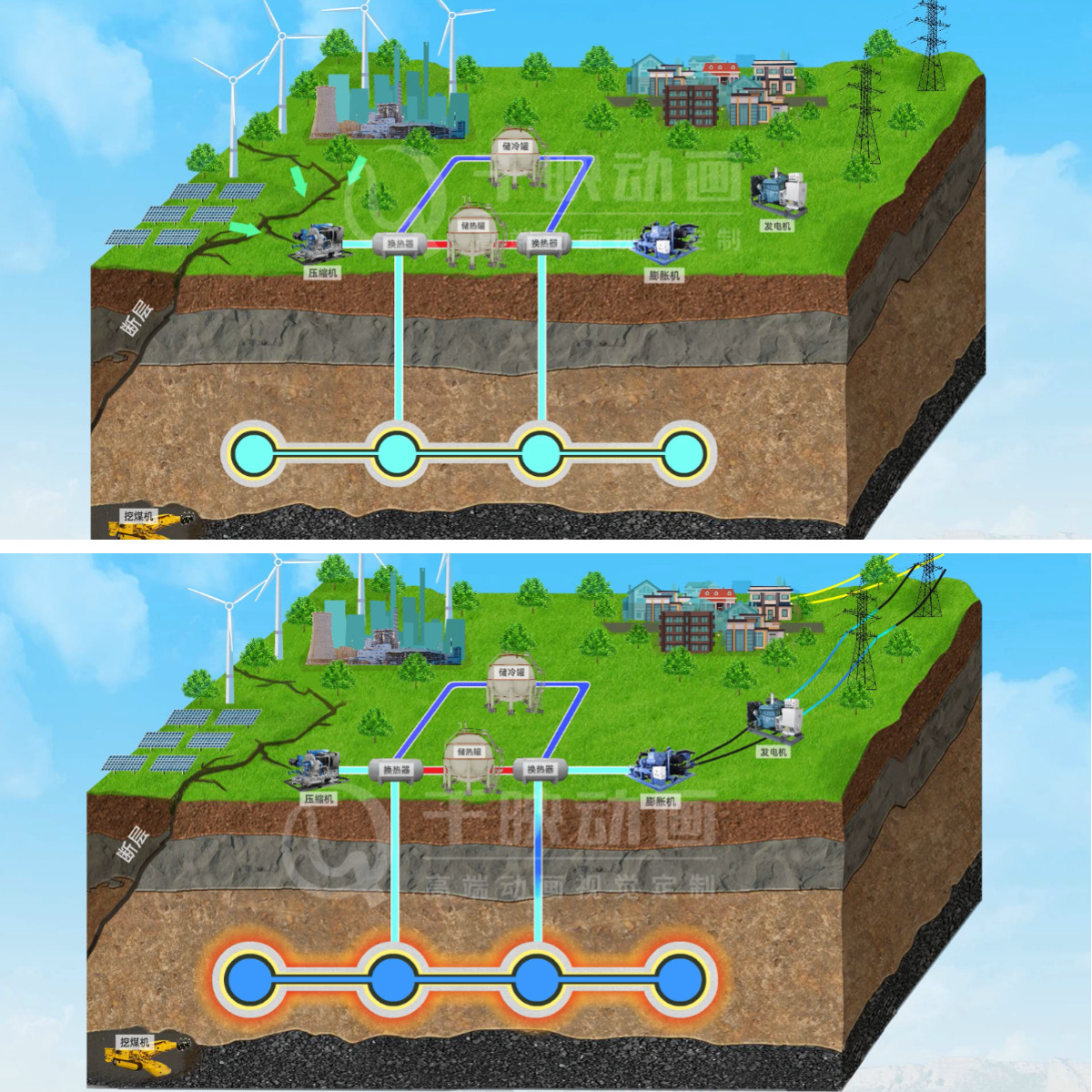2.5D动画不仅将空气储能技术转化为大众可感知的视觉内容。不仅能帮观众轻松理解空气储能的工作逻辑,也成为了实用的传播工具。